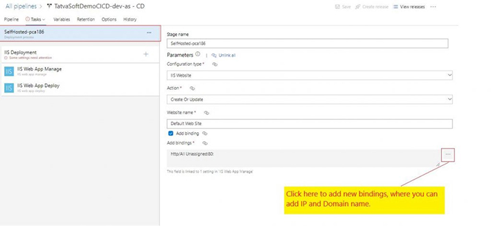 - Go to the Tasks tab to edit the template as shown in the image. Change the bindings and website name as you require.